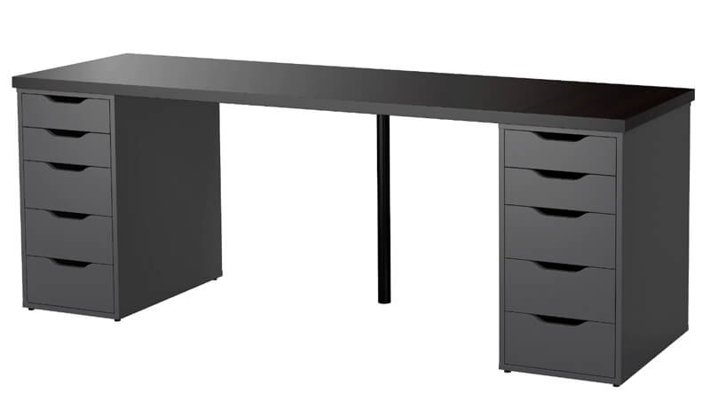 Esta mesa com o nome de LINNMON / ALEX acaba por ser uma combinação simples das gavetas "Alex" e uma tábua no topo. Tenho uma destas "Alex" aqui em casa e é perfeito para guardar toda a tralha que precisas. As gavetas são amplas e de qualidade e terás uma mesa com excelentes arrumações sem perder a sexyness.