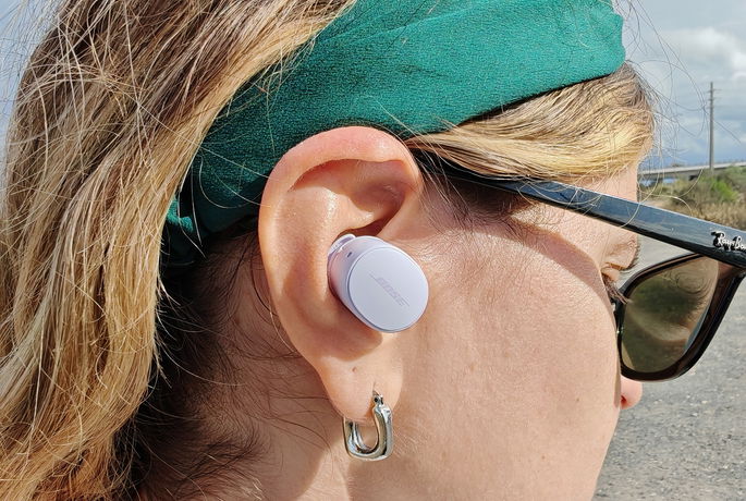 Este é o ponto onde a Bose acaba por poupar mais para trazer uns auriculares abaixo de 200 €. Os Bose QuietComfort estão disponíveis no lilás gelado da nossa unidade de teste, mas também em preto e branco. Apresentam um perfil intra-auricular, pelo que entram no canal auditivo e ficam dispostos de forma proeminente na orelha. Isso ajuda ao bom isolamento passivo.