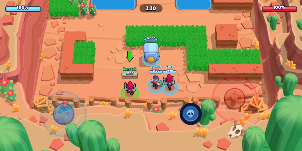 Em primeiro lugar temos o modo mais comum: pega-gemas. Neste modo jogas em 3 contra 3. No centro do mapa tens uma mina de gemas que vai largando cristais. O objectivo é que a tua equipa colecione 10 gemas para começar uma contagem de 15 segundos.