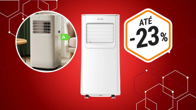 Para te ajudar, temos uma excelente opção para a tua primavera/verão: o Ar Condicionado Portátil Evvo Clima P7 3 em 1, ar condicionado, ventilador e desumidificador, por menos de 200 €, com 10% extra em talão. O valor em talão pode ser utilizado entre 7 e 13 de abril de 2026.