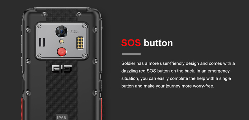 Semelhantemente ao outros terminais robustos, o Elephone Soldier não tem o design mais elegante de todos. Contudo, conta com o sensor biométrico na parte lateral e um botão SOS programável para um dos teu contactos na parte traseira do dispositivo.