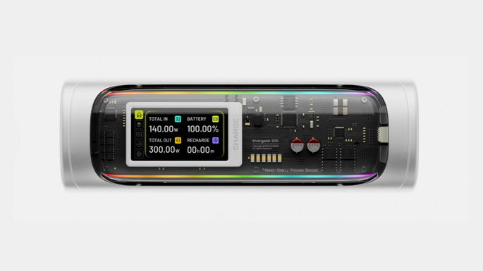 Como já é habitual nos produtos da linha Shargeek, o design não passou despercebido. A estrutura em liga de alumínio tem um acabamento cinzento prateado e uma lateral parcialmente transparente. Através dessa janela é possível ver um visor a cores que mostra dados em tempo real, como potência de entrada e saída, temperatura e nível da bateria.