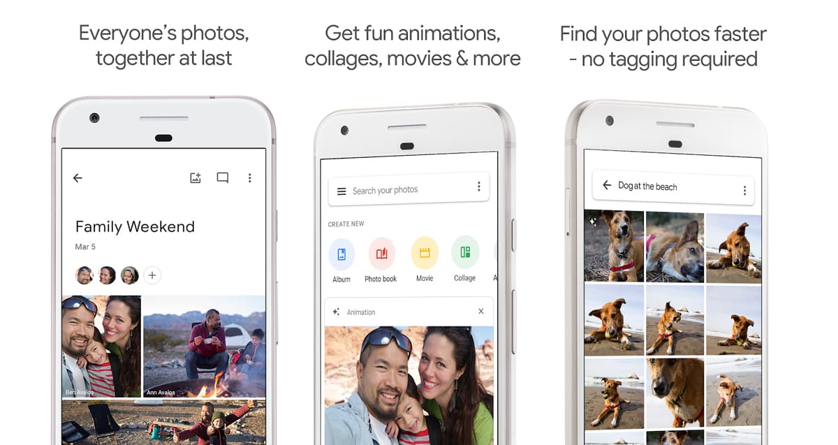 Graças à implementação de capacidades relacionadas com inteligência artificial, o Google Fotos tem a capacidade para organizar as tuas fotos de forma autónoma. Esta organização é feita em 6 categorias: Locais, Vários, Vídeos, Colagens, Animações e Pessoas.