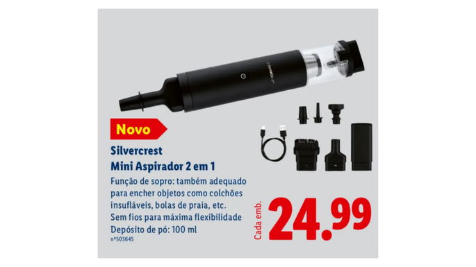 Este mini aspirador sem fios por 24,99 € no Lidl custa normalmente 35–50 € em lojas online como a Amazon. Vê também: Lidl lança mini aspirador 2 em 1 por menos de 25 euros que dá imenso jeito!