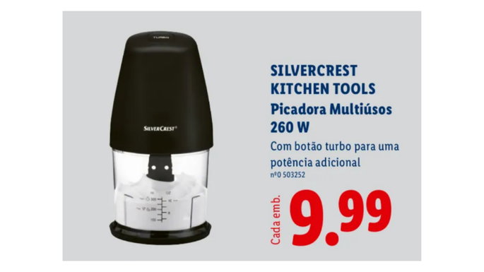 Se procuras uma forma prática de preparar ingredientes na cozinha, esta SILVERCREST KITCHEN TOOLS Picadora Multiúsos 260 W pode ser uma boa opção. Custa 9,99 € cada embalagem e está disponível na loja de 09.03 a 15.03. Se preferires, também podes encontrar picadoras semelhantes noutras lojas por valores entre 10 € e 25 €.