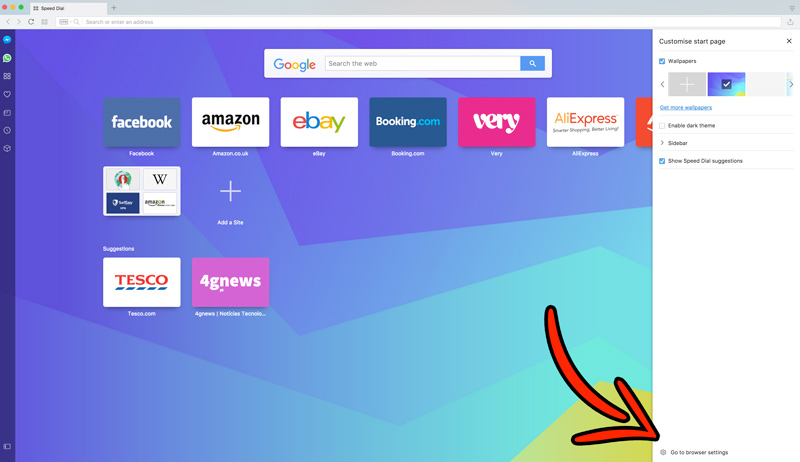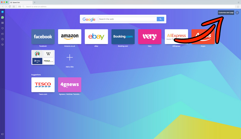 Instalar e abrir o browser. Logo de seguida clica em "Customise Start Page". Depois de abrir uma tab à esquerda dirige-te ao final dessa mesma.