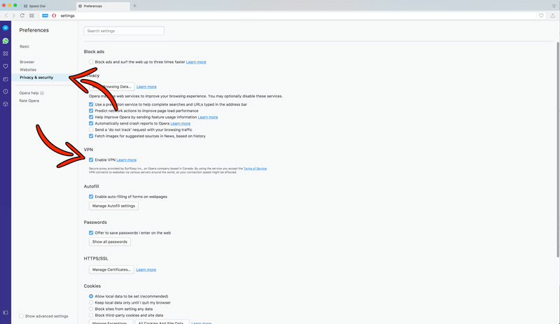 No canto direito seleciona "Privacy & Security" e de seguida ativa a opção "VPN"